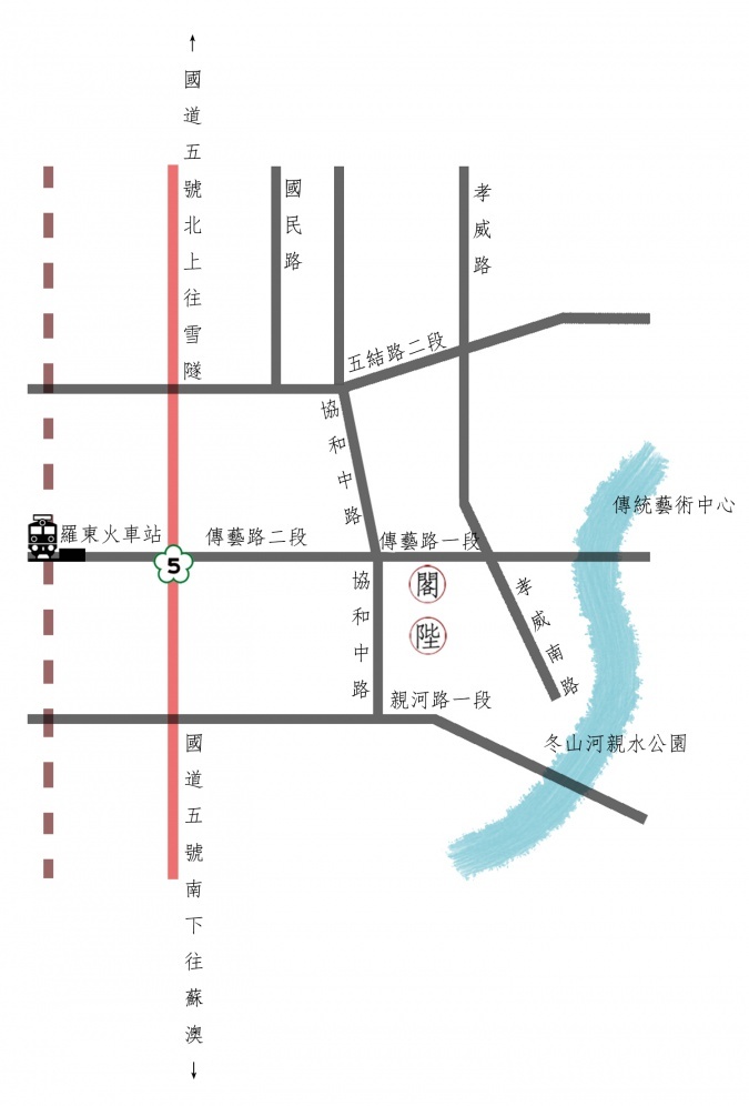 台七丙省道 → 經過傳統藝術中心(右轉傳藝路) → 閣 陛 MASTER